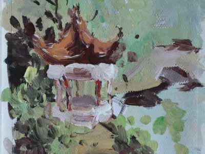 北宋山水画中的“亭子”一般都藏得比较深远隐蔽。如北宋郭熙的《早春图》,在图中可以隐约看到“亭子”,亭子藏于两树之间的后方,小小的,若隐若现。亭子的整体形象比较模糊,亭子画的小,可能是画家本意就想把亭子表现得若隐若现,似有若无。亭子的笔画稍显圆润,但细看,并不是圆亭,而是个四方亭。亭内好像还有两只石凳,是供游人休闲娱乐的。从北宋《溪山图》可以看到亭子藏于繁密的树丛后,画的非常小,若隐若现。亭子画的又远又不清晰,画家可能是以此来点缀,由此会显得房屋的深远,不至于给人一种戛然而止的感觉。依稀可见亭子的四根柱子中的三根,还有个三角形的屋顶,或许画家就是这么简单的勾